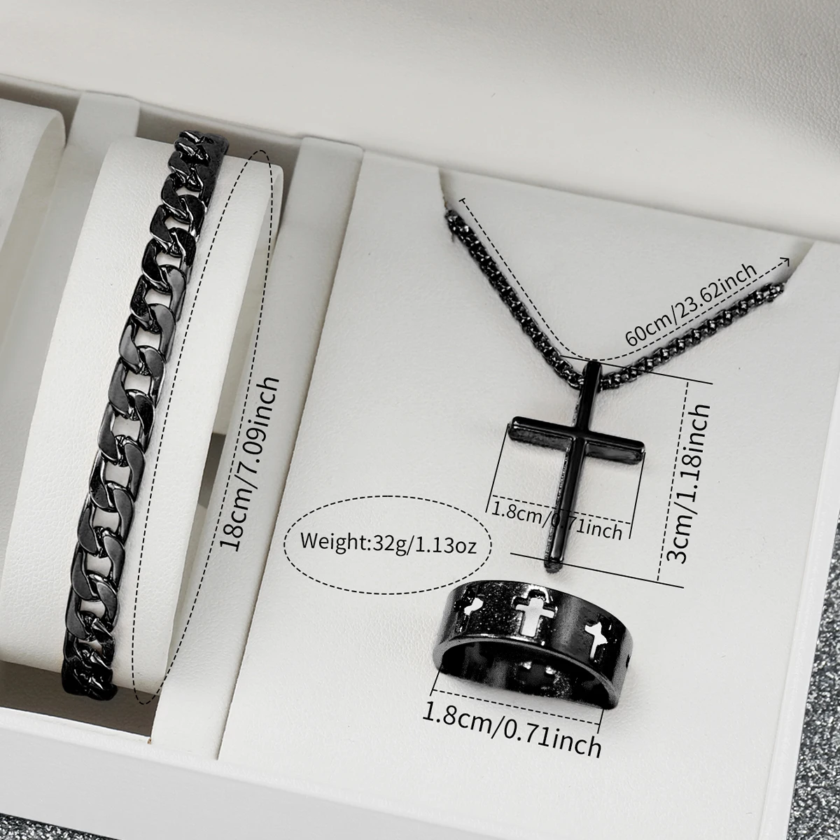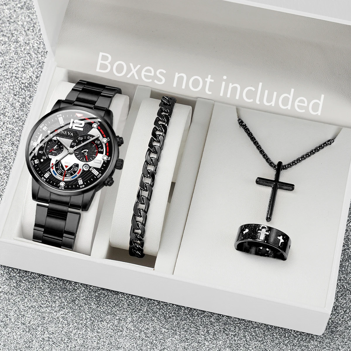 Elevate your style with this premium 4PCS Men's Quartz Watch and Jewellery Set featuring a sleek black steel band. Perfect for business or casual wear, this exclusive collection includes a wristwatch, bracelet, necklace, and ring, making it the best seller for fashion-forward men.