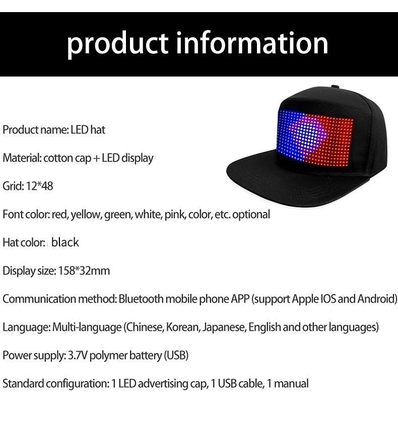 Light up the night with our Smart LED Hat featuring Bluetooth control and a vibrant multi-language display. This advertising cap is perfect for parties and events where you want to stand out!