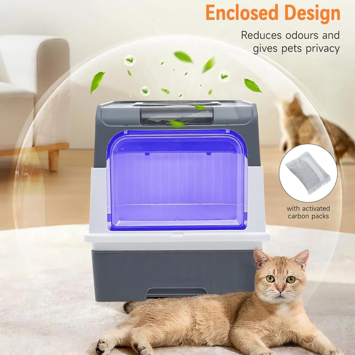 Tired of the constant litter mess and unpleasant odours? The ultraviolet sterilization cat litter box is exactly what you need! This innovative litter box features a spacious enclosed design to accommodate large kitties. It comes with a chargeable UV sterilization lamp with all-around illumination that effectively eliminates bacteria and germs, ensuring a clean and odour-free environment. To help with the clean-up, a scoop is included in the set.