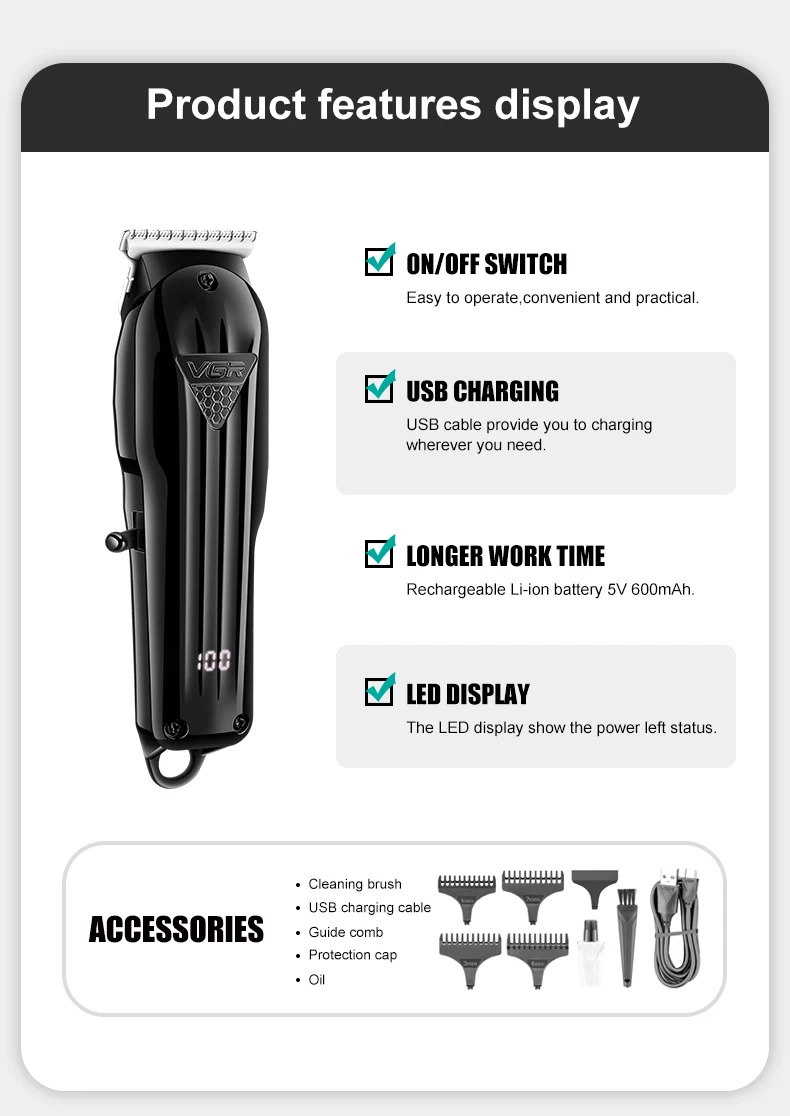 Achieve salon-quality haircuts at home with the VGR Cordless Hair Trimmer, designed for effortless precision.