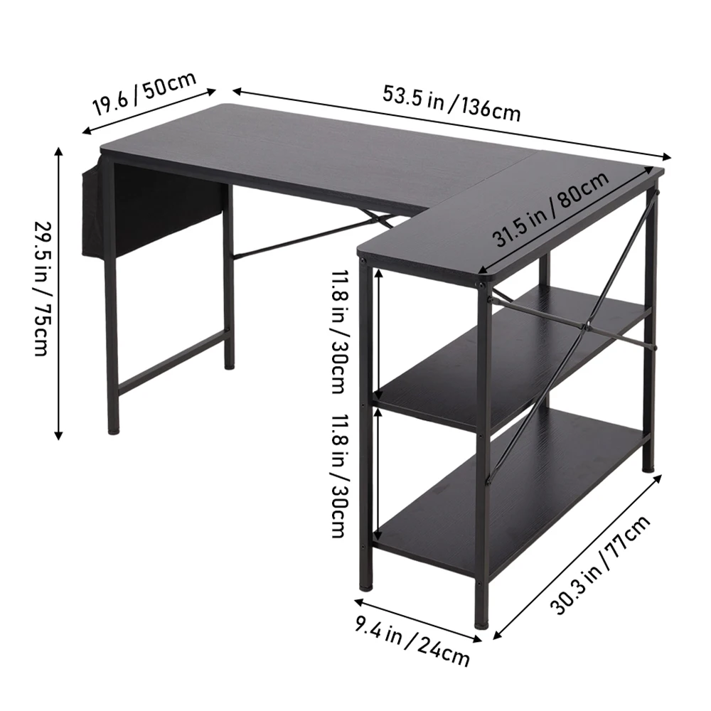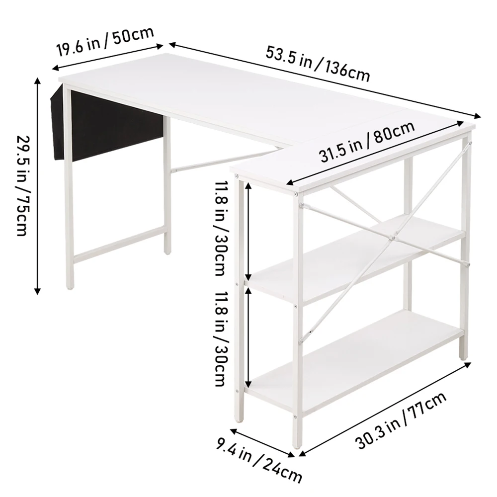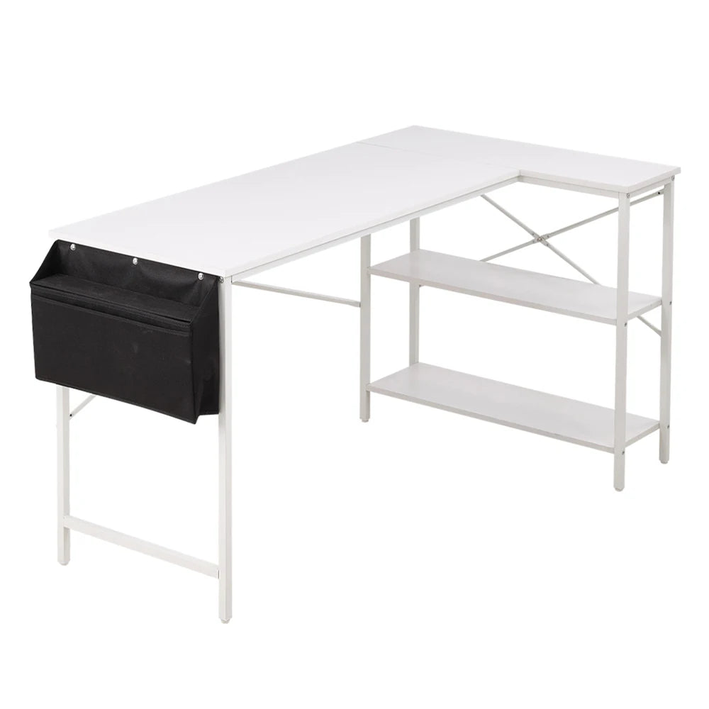Upgrade your workspace with this sleek, L-shaped office desk—ideal for both home and professional settings. The durable, powder-coated surface resists scratches and maintains its modern look. A spacious tabletop offers ample room for work, while lower shelves provide versatile storage for books, files, and essentials. A hanging side bag keeps stationery and documents within reach. Rounded edges add a touch of safety and style, making it perfect for work or study.